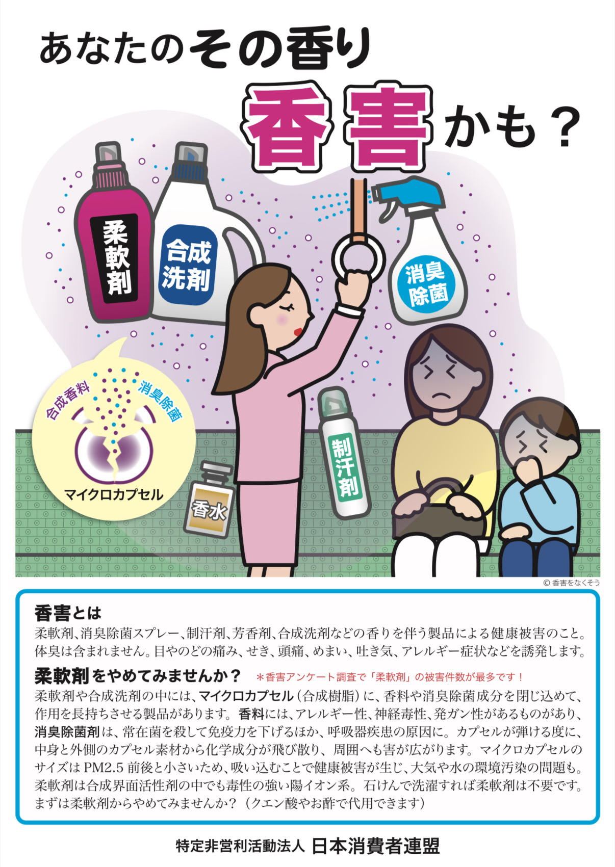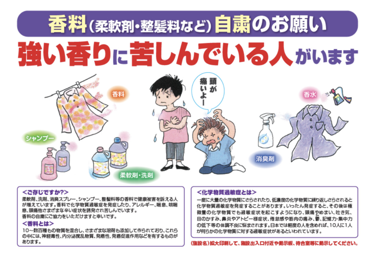 身の回りの何気ない物が影響し、苦しい思いをしているかたが周囲にいるかもしれません。公共の場や人の集まる場では特に、香料(香水・整髪料など)の使用について、周りのかたがたへのご配慮をお願いいたします。